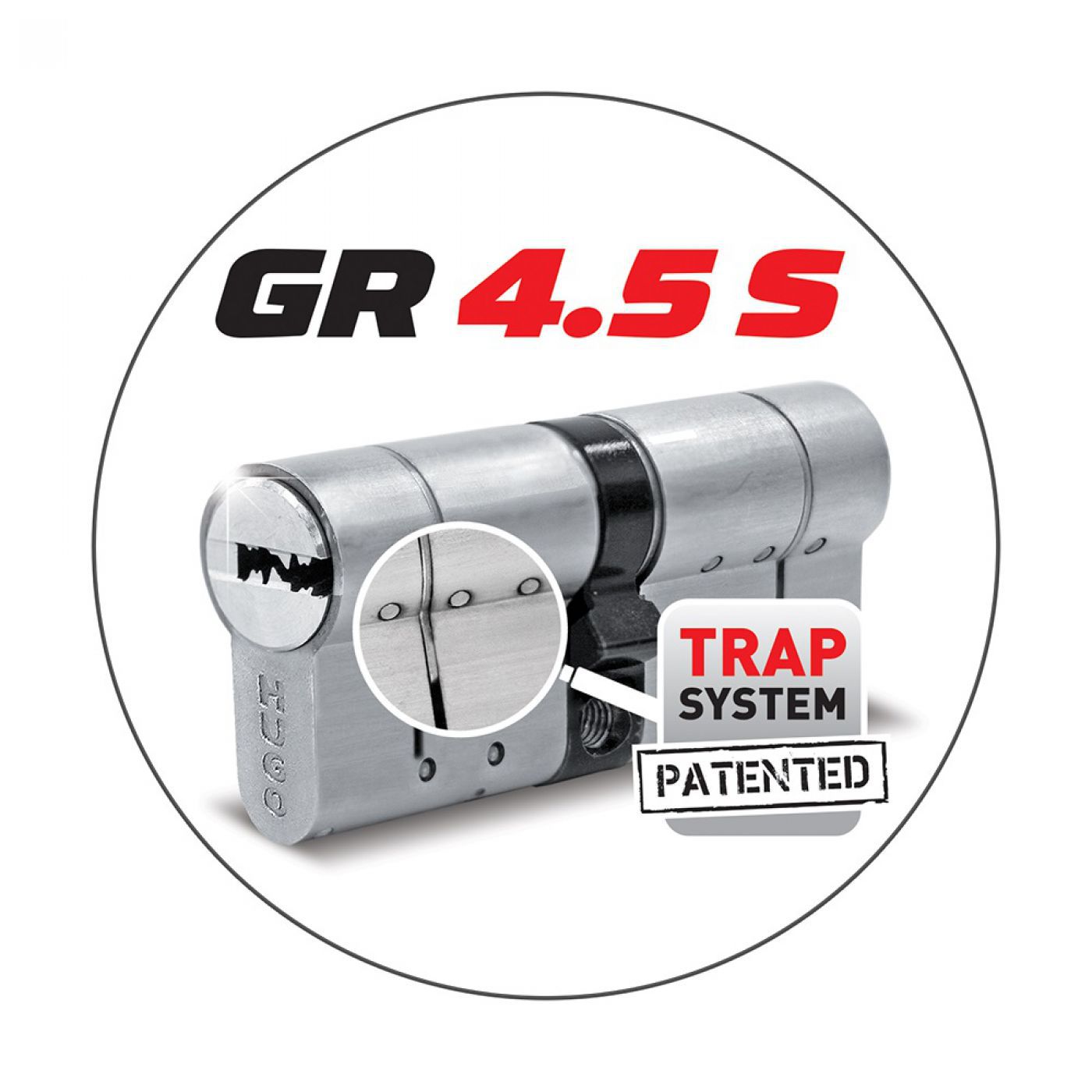 Διαθέτει: • Κύλινδρο ασφαλείας GR 4.5S • Μασίφ σώμα από επισκληρυμένο ατσάλι και γαλβανισμένη επίστρωση για έξτρα δύναμη & αντοχή. • Ισχυρό σύστημα κλειδώματος με μπίλιες για υψηλή αντοχή στο τρύπημα και στο βίαιο τράβηγμα. • Πείρο από επισκληρυμένο μολυβδένιο για έξτρα δύναμη και αντοχή κατά της διάβρωσης. Χαρακτηριστικά: • Πλάτος: 88mm • Επίπεδο Ασφαλείας: 10 • Κλειδιά: 3 • Ανταλλακτικό Κλειδί: 6075 • Χρώμα: Μαύρο