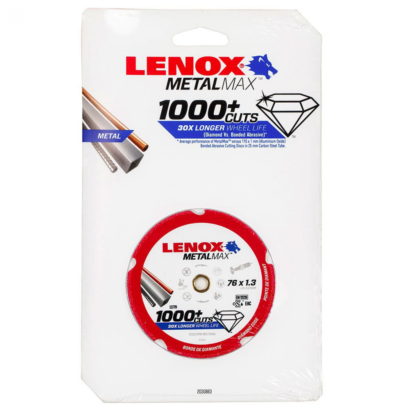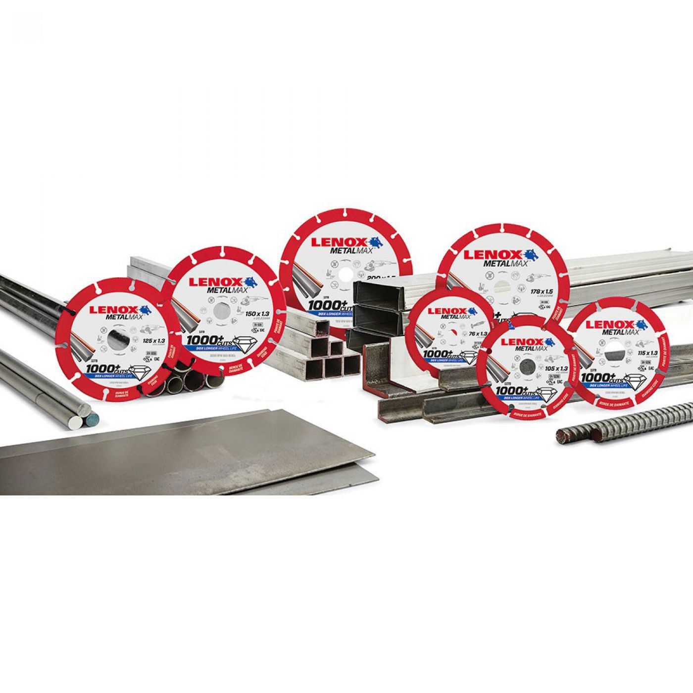 Η σειρά LENOX METALMAΧ™ αποτελεί τη νέα εναλλακτική λύση στους δίσκους κοπής. Η πρωτοποριακή τους τεχνολογία διαμαντιού προσδίδει εξαιρετική αντοχή ώστε να σας επιτρέψει να μεγιστοποιήσετε την αποτελεσματικότητα της εργασίας σας και να μειώσετε το κόστος των εργασιών κοπής μετάλλου. Οι δίσκοι κοπής LENOX METALMAX™ μπορούν να χρησιμοποιηθούν σε διάφορους τύπου μετάλλων, συμπεριλαμβανομένου του χάλυβα, των λαμαρίνων, του ανοξείδωτου χάλυβα, της ράβδου οπλισμού, του χυτοσιδήρου, του αλουμινίου