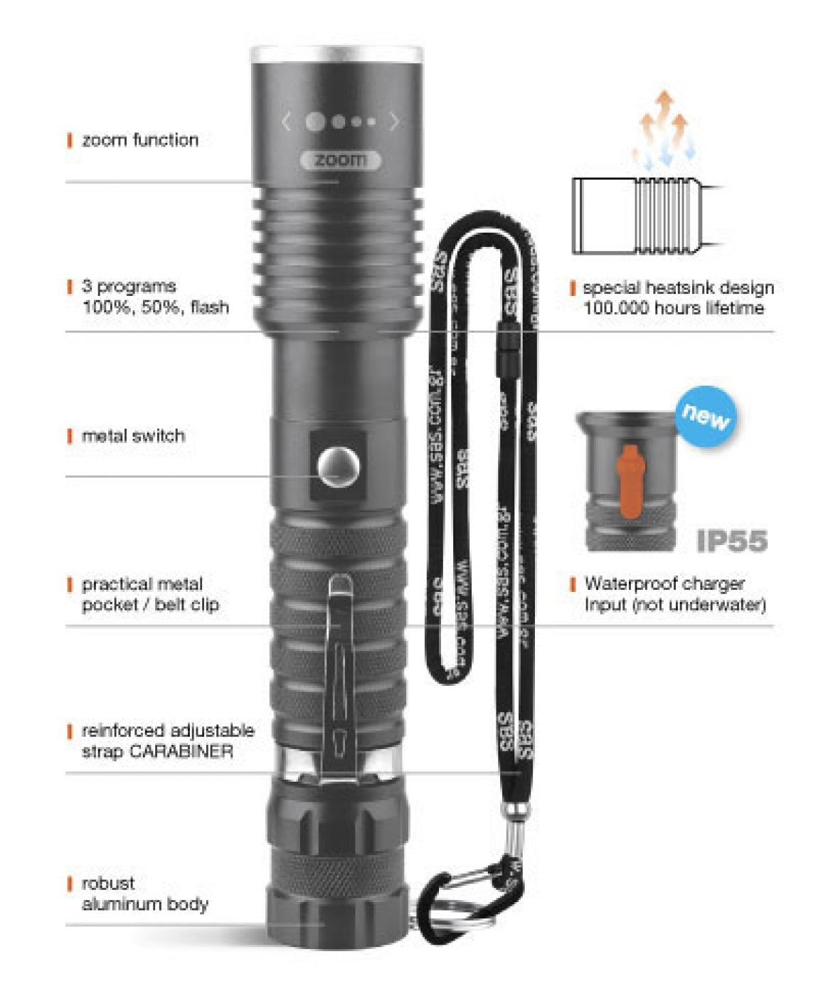 Μεταλλικός διακόπτης Μεταλλικό κλιπ τσέπης / ζώνης 3 προγράμματα (100%, 50%, φλας) Ενισχυμένο ρυθμιζόμενο λουρί CARABINER Αδιάβροχη υποδοχή φόρτισης (όχι υποβρύχια) Ανθεκτική κατασκευή αλουμινίου