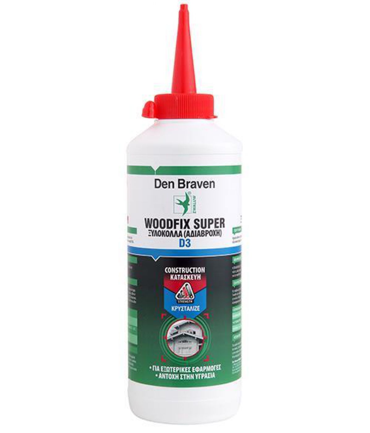 -Περιγραφή: Ισχυρή και αδιάβροχη κρυσταλλιζέ κόλλα ξύλου, ταχείας πήξεως, με βάση PVAC. Μεγάλη αντοχή στην υγρασία. Στερεά κατά όγκο 50%. Υπερκαλύπτει τις προδιαγραφές D3 EN 204/205. Για εσωτερικές και εξωτερικές εφαρμογές. -Εφαρμογές: Για συγκολλήσεις σε ξύλινες εφαρμογές όπως ξύλινες πόρτες, κάσες παραθύρων, έπιπλα, πέργκολες, κουζίνες κλπ. Επιπλέον για συγκόλληση νοβοπάν, φορμάικας, κόντρα πλακέ θαλάσσης, ξύλινων δαπέδων κλπ -Περιορισμοί: Να μη χρησιμοποιείται σε ξύλα με υγρασία περισσότερη από 15%. -Ξυλόκολλα ταχείας πήξης WOODFIX D3 αδιάβροχη 750gr κρυσταλλιζέ με βάση PVAC, στερεά κατά όγκο 50%, υπερκαλύπτει προδιαγραφές D3 EN 204/205, για εσωτερικές και εξωτερικές εφαρμογές