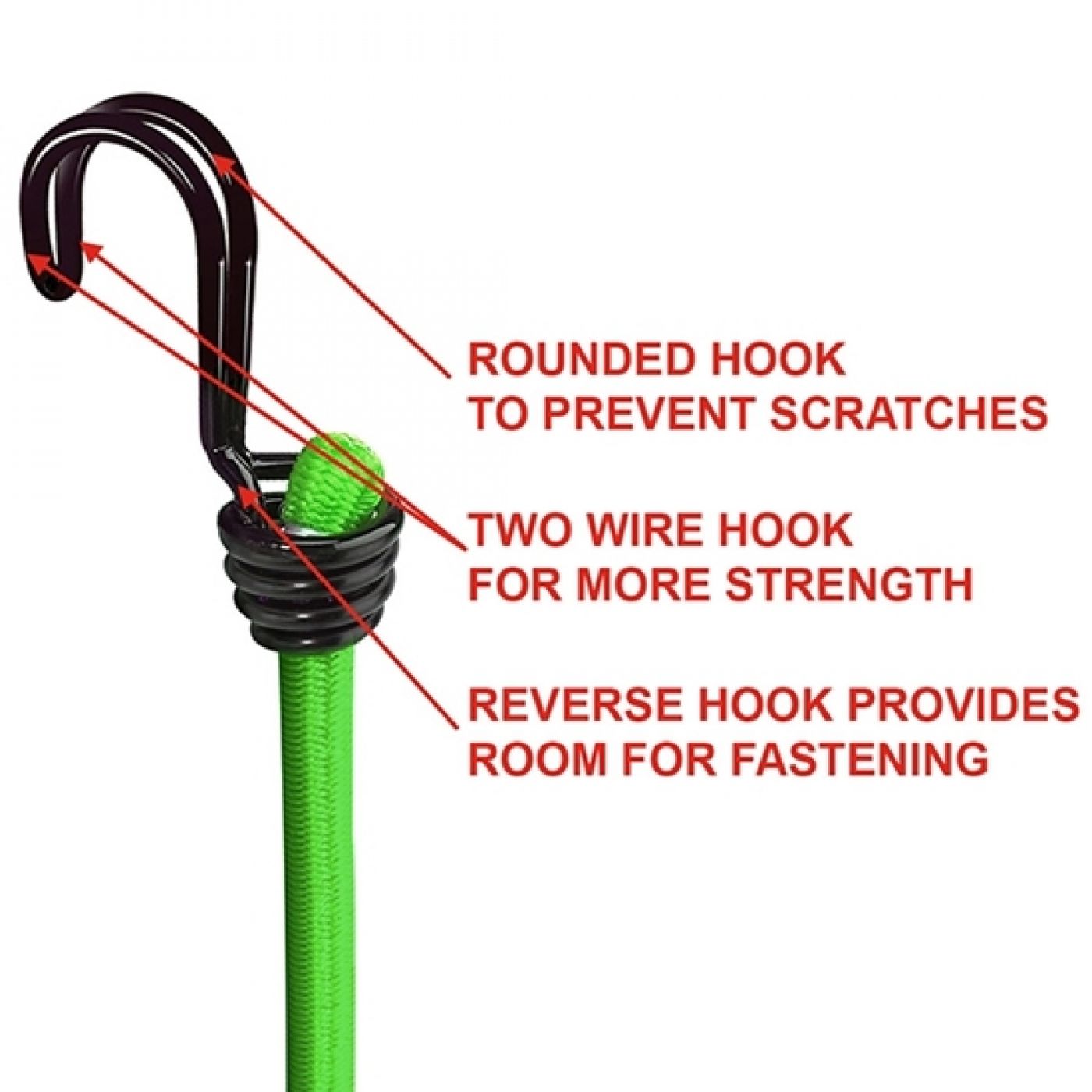 Το σετ διαθέτει δύο κορδόνια "bungee" 80cm με συρμάτινα άγκιστρα για πρόσθετη αντοχή. Η αντίστροφη σχεδίαση των γάντζων παρέχει επιπλέον χώρο για στερέωση αντικειμένων. Τα άγκιστρα είναι στρογγυλεμένα για αποφυγή γρατσουνιών.