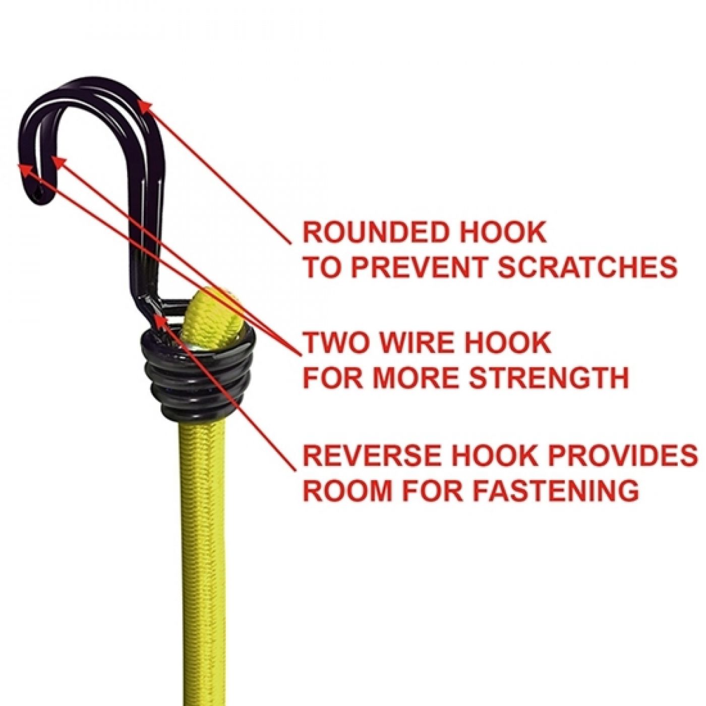 Το σετ διαθέτει δύο κορδόνια "bungee" 100cm με συρμάτινα άγκιστρα για πρόσθετη αντοχή. Η αντίστροφη σχεδίαση των γάντζων παρέχει επιπλέον χώρο για στερέωση αντικειμένων. Τα άγκιστρα είναι στρογγυλεμένα για αποφυγή γρατσουνιών.