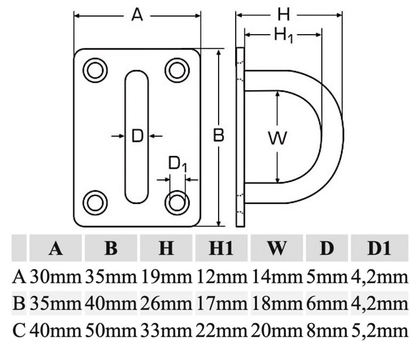 A:30mm B:35mm H:19mm H1:12mm W:14mm D:5mm D1:4,2mm